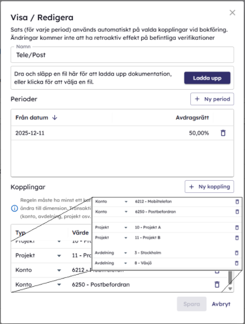1. En kostnad bokförd på konto 6212, med avdelning Stockholm och Projekt A, kommer att matcha regeln och få 50 % avdrag.
