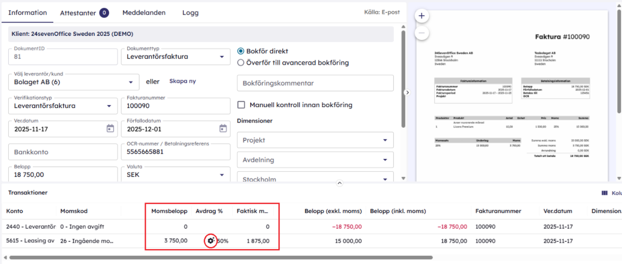 Systemet sätter automatiskt rätt avdragssats i kolumnen Procentuellt momsavdrag, baserat på konto, dimensioner och datum.