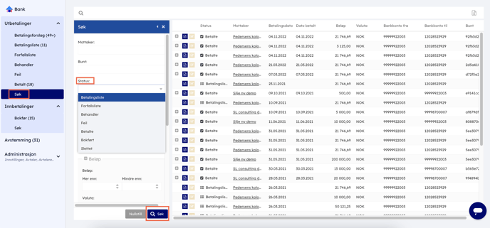 I bankmodulen, gå till fliken Sök > Utbetalningar. Här kan du antingen välja alla eller använda sökfilterna för att filtrera listan. När du har gjort ditt val, klicka på Sök längst ned till vänster.