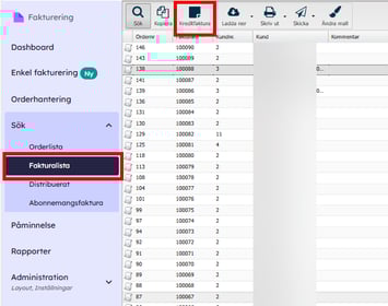 - Du hittar fakturalistan via Fakturering > Sök > Fakturalista. Markera fakturan i fakturalistan eller öppna den.