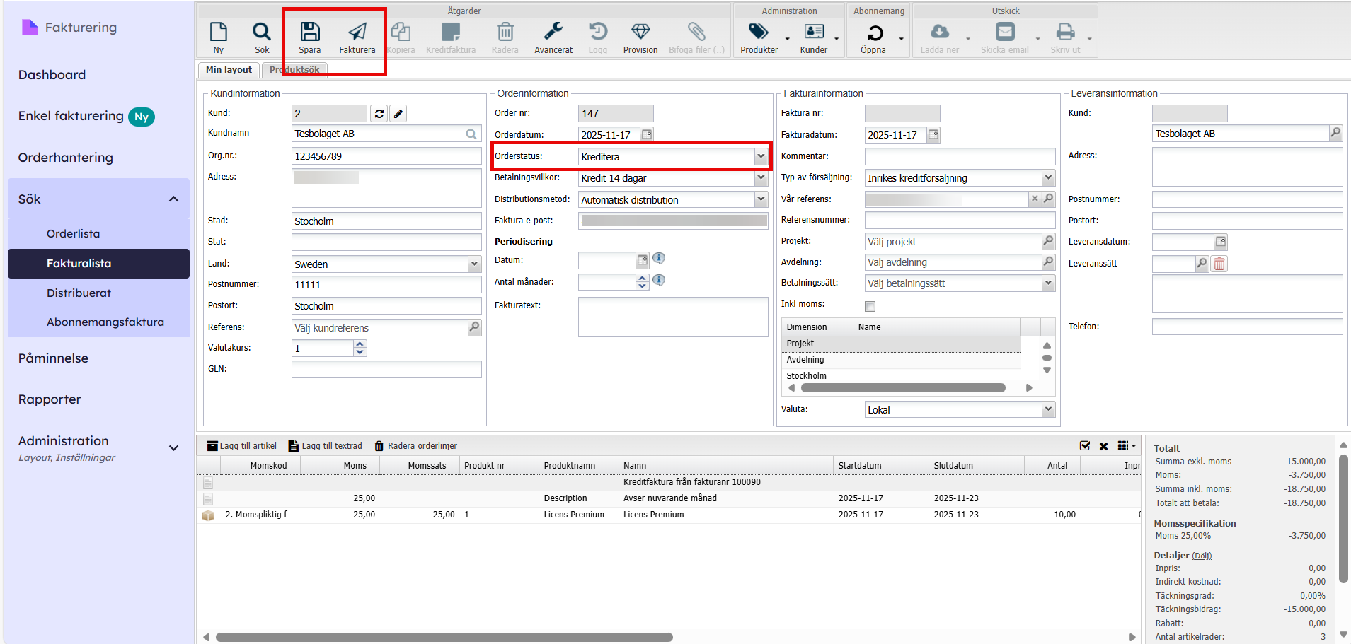- Klicka på Fakturera. Orderns status ändras automatiskt till Krediterad.