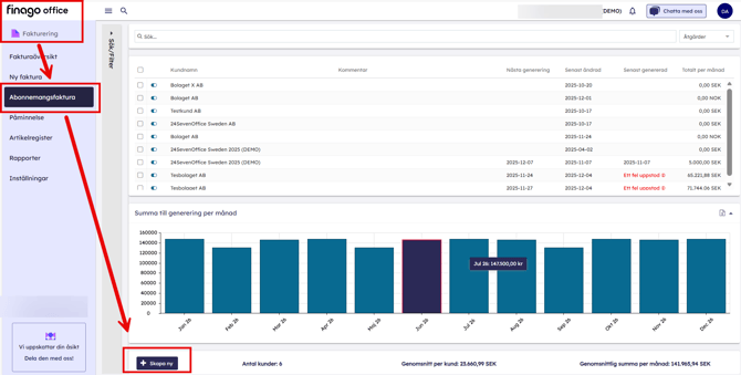 Börja med att gå till Fakturering > Abonnemangsfaktura > Skapa ny (blå knapp längst ned på sidan).