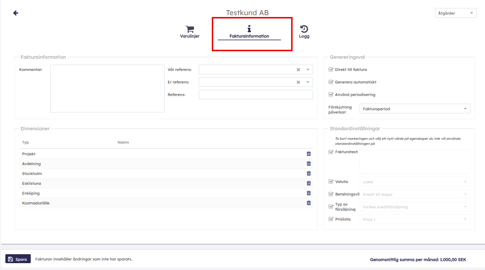 Här kan du ange referenser och kopplingar till dimensioner. Här kan du också göra ändringar i fakturan som då dominerar över dina standardinställningar för fakturor.