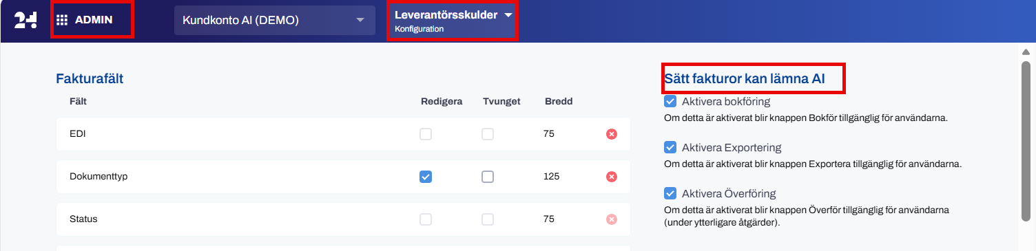 Admin > Konfiguration > Sätt fakturor kan lämna AI.