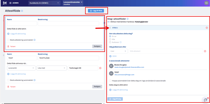 Lägg till flöde > namnge Attestflödet och ange en kort och tydlig beskrivning > lägg till Aktivering/Triggers. Därefter ange de önskade stegen i attestflödet i den vänstra rutan.