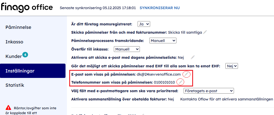Det är fullt möjligt att definiera ett eget telefonnummer och en e-postadress som ska visas när man skickar ut påminnelser till kunder.