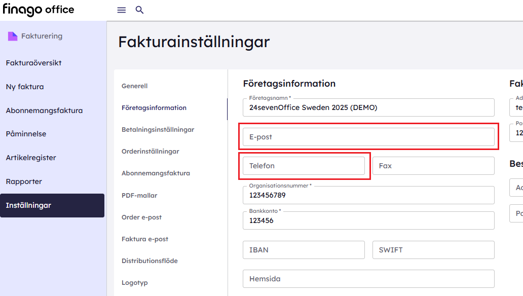 Om man inte anger någon av uppgifterna, kommer systemet att hämta e-post och telefonnummer från företagsinformationen i inställningarna i fakturamodulen.