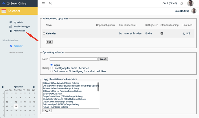 I 24SevenOffice Kalender kan du skapa flera kalendrar enligt dina önskemål och själv bestämma vilka som ska ha åtkomst. Genom att klicka på "Administrer" och sedan "Skapa ny kalender" kan du ange ett önskat namn på den nya kalendern och vilken åtkomstnivå den ska ha.