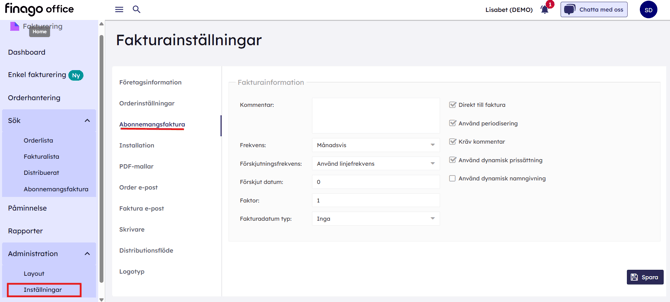 För att komma igång med abonnemangsfakturering gå till Fakturering > Inställningar > Abonnemangsfaktura. Här ställer du in parametrar som gäller för alla nya abonnemangsfakturor som skapas.