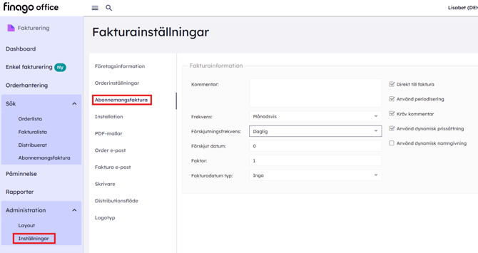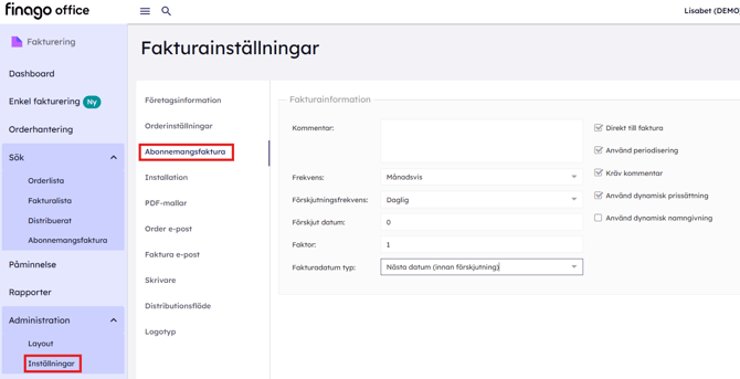 Först måste följande inställningar göras under Fakturering > Inställningar > Abonnemangsfaktura: