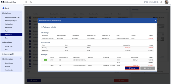 - Du kommer då att se en förhandsvisning av hur betalningen kommer att bokföras. Om allt ser bra ut, klicka på "Bokför" igen och betalningen kommer att bokföras mot huvudbokskontot.