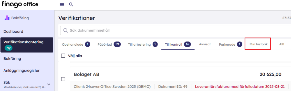 Alla attestanter som ingår i något attestflöde och har godkänt, vidarebefordrat eller avvisat en verifikation kommer att kunna hitta den under "Min historik" i Verifikationslistan.