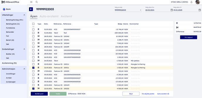 TIPS! Banktransaktioner registreras i systemet när vi tar emot avstämningsfiler från banken, och systemtransaktioner hamnar i avstämningen när de bokförs mot huvudbokskonton som är kopplade till bankavtalet.