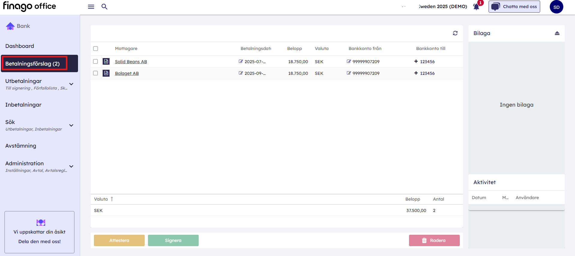 Här kommer vi att gå igenom betalningsförslag i bankmodulen och hur du kan se betalningsinformation, godkänna, signera och ta bort betalningar.