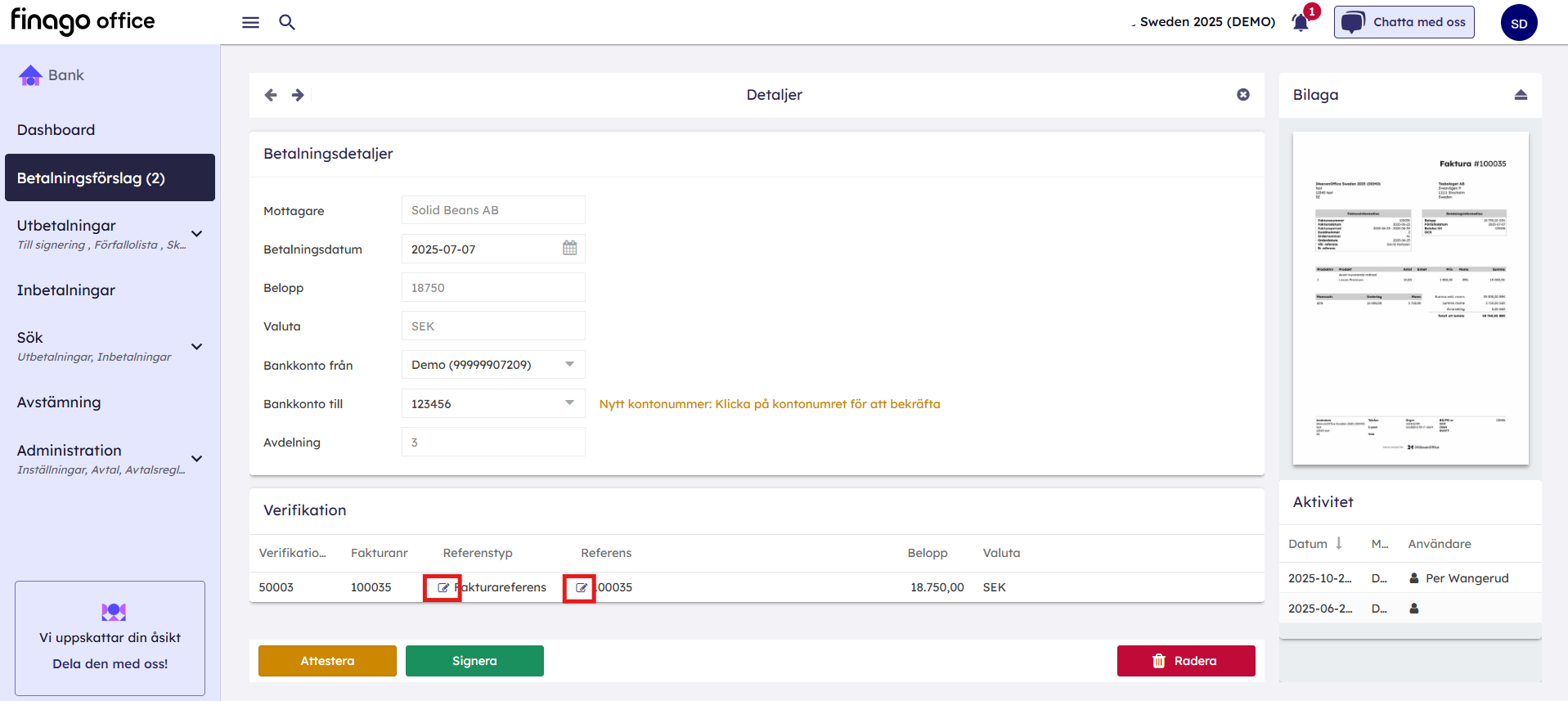 • Om du klickar på betalningen visas verifikationens information som ligger bakom betalningen; verifikationsnummer, fakturanummer, belopp, valuta, referenstyp, referensinmatning och förfallodatum.