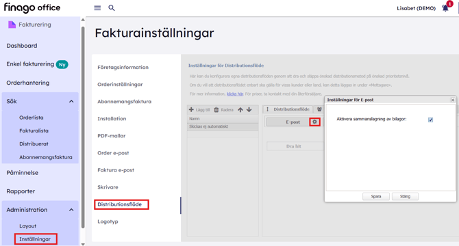 Fakturering > Administration > Inställningar > Distributionsflöde > Klicka på kugghjulet bredvid E-post (grått) och bocka i rutan för "Aktivera sammanslagning av Epost-bilagor".