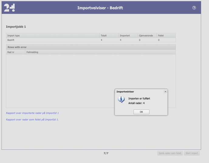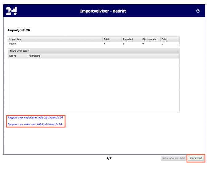 Om det finns rader som misslyckades kan du se en sammanfattning av dem i "Rapport över importerade rader som misslyckades" och göra nödvändiga ändringar i importfilen innan du startar en ny importprocess.
