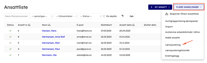 - Gå till Anställningslistan i huvudmenyn på vänster sida. Välj sedan "Lönerevision" under fliken "Fler åtgärder".