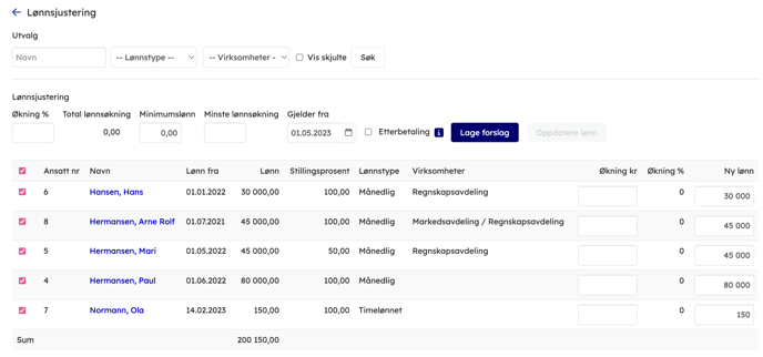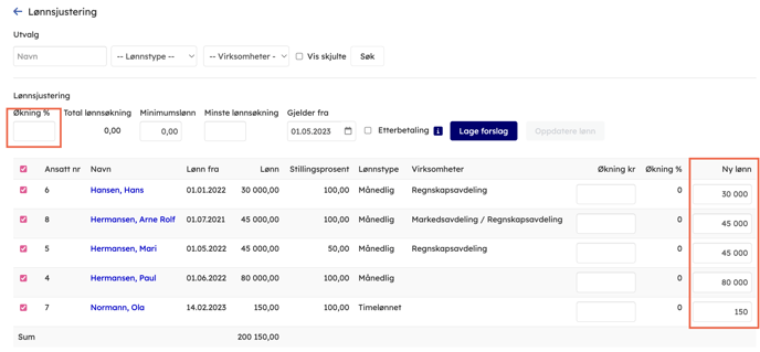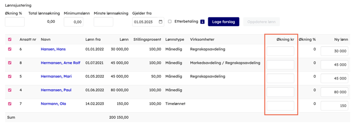 - Om du önskar höja lönen med en specifik summa kan du enkelt göra det genom att skriva in beloppet direkt i kolumnen "Ökning i kr".