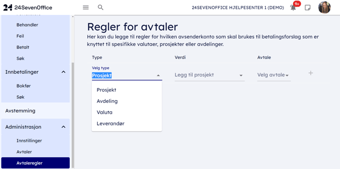 - Navigera till Bank > Administration > Avtalsregler i menyn på vänster sida för att skapa en ny regel. Välj först vilken typ av regel du vill skapa, såsom projekt, avdelning, valuta eller leverantör.