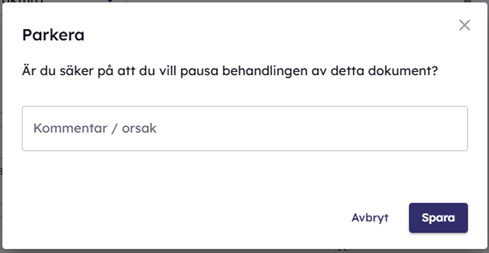 - "Parkera" - pausar hanteringen av verifikationen och kommentar/orsaken ska anges för att ge verifikationen statusen "Parkerad". Verifikationen hittas sedan i Verifikationslistan under fliken "Parkerade" och inne i verifikationen kan man sedan "Återuppta behandling" av verifikationen.